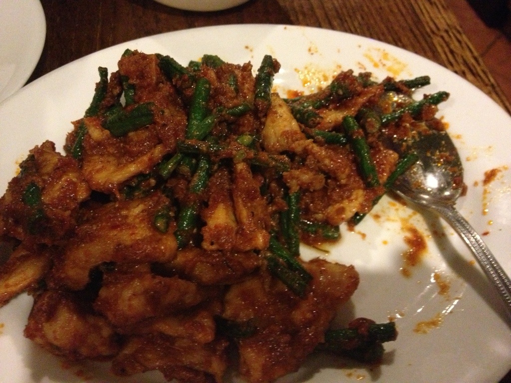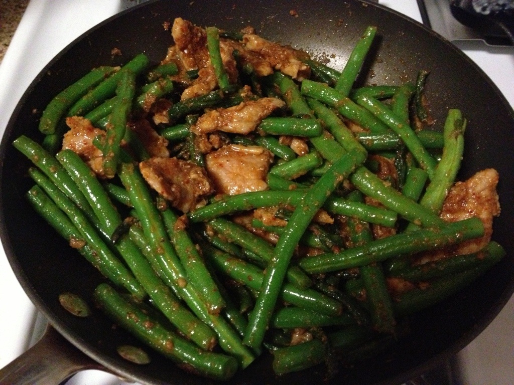 First, stir fry the string beans with garlic. Add a little of soy sauce, oyster sauce and a little brown sugar then add the leftover Khai-pad-prik-khing and add a little water. Taste and adjust it by using those ingredients mentioned earlier.