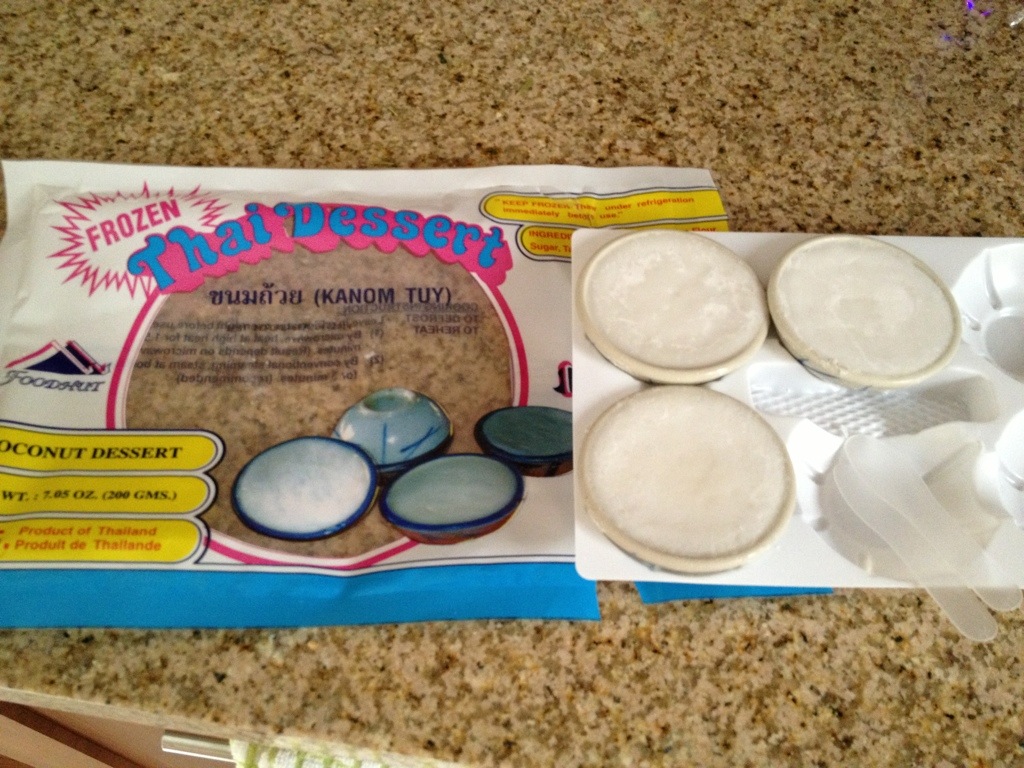 After living in New York City for almost a decade, I barely remembered when was the last time I had some Thai desserts. The same night we made a trip to a famous Thai restaurant in Queens, across the street, there is a Thai grocery! We discovered that they had these steamed coconut puddings that I love! They kept these puddings frozen though. However, we bought a pack to give it a try.