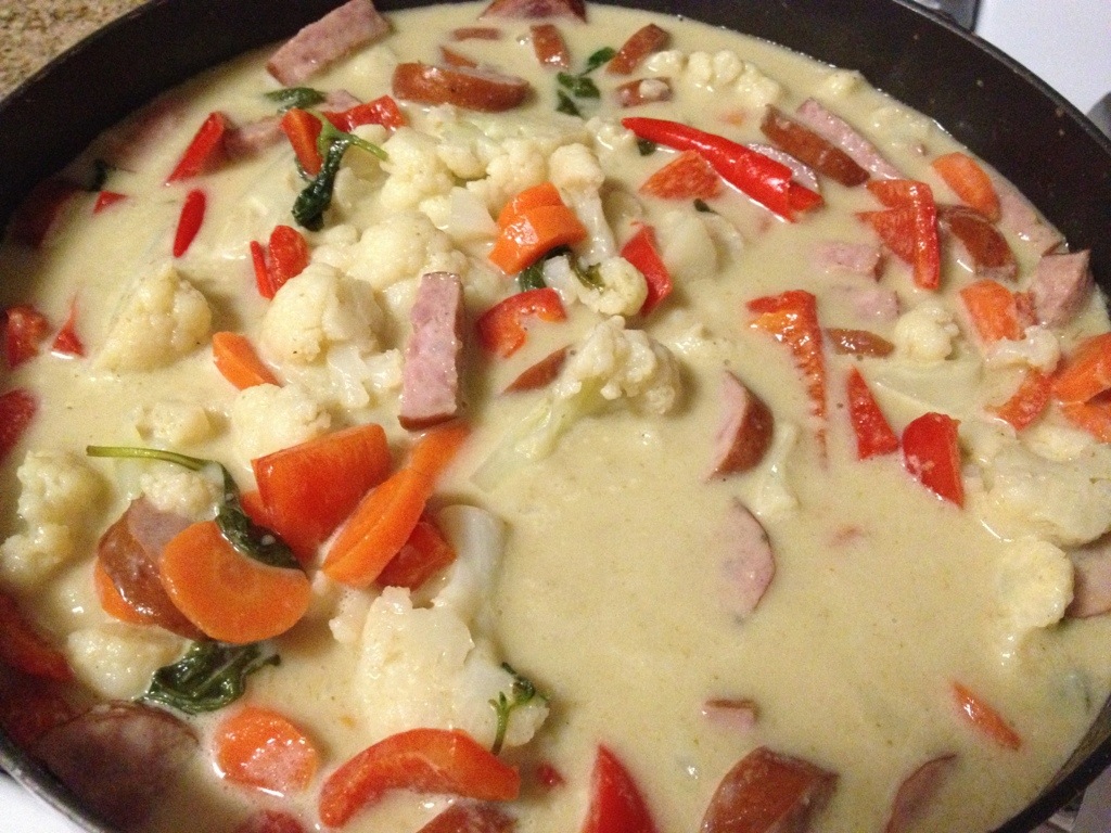 One everything is prepped, turn on the stove medium high and use a medium saucepan, pour 2 cans of coconut milk in the pan and brings it to almost boil then add MAESRI green curry paste and mix them well. Add chili peppers. Add hard vegetables — carrots first then cauliflower. Cook till they are a little soft then add the cut up Kielbasa and cook for a few minutes. Add oyster sauce, soy sauce and try it. If it’s too spicy then add a little brown sugar and taste it. Lastly, add fresh basil leaves in and lower the heat. Serve it with some cooked Jasmine rice.