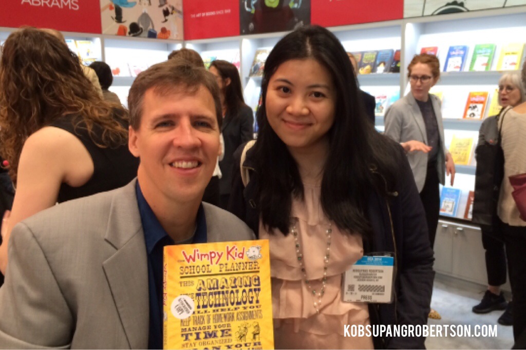After Author Breakfast ended, I wandered around exhibit checking out books. One question that was quite popular at BEA is “I’m sorry to bother you, but where did you get that cute tote,” I couldn’t even be more proud of my bright orange tote bag with The Diary of The Wimpy Kid print on it given out from ABRAMS booth where Jeff Kinney’s signing his new planner today. I was fortunate enough I made the cut and got to meet him and had a little chat.